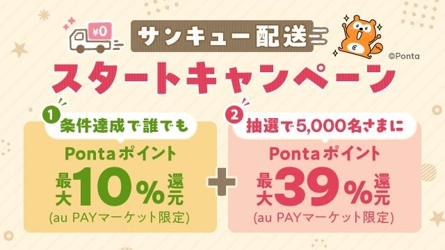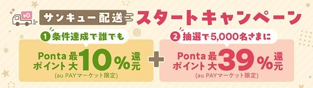 「サンキュー配送」と「Pontaパス特典」の提供開始を記念して、2025年3月1日午前10時から3月15 日午前9時59分まで、「サンキュー配送スタートキャンペーン」を実施します。Pontaパス会員が「サンキュー配送」対象となる商品をお買い物いただくと、全員にご購入金額の最大10%のPontaポイント(au PAY マーケット限定)をプレゼントします。さらに、抽選で5,000名さまにご購入金額合計の最大39%のPontaポイント(au PAY マーケット限定)があたります。