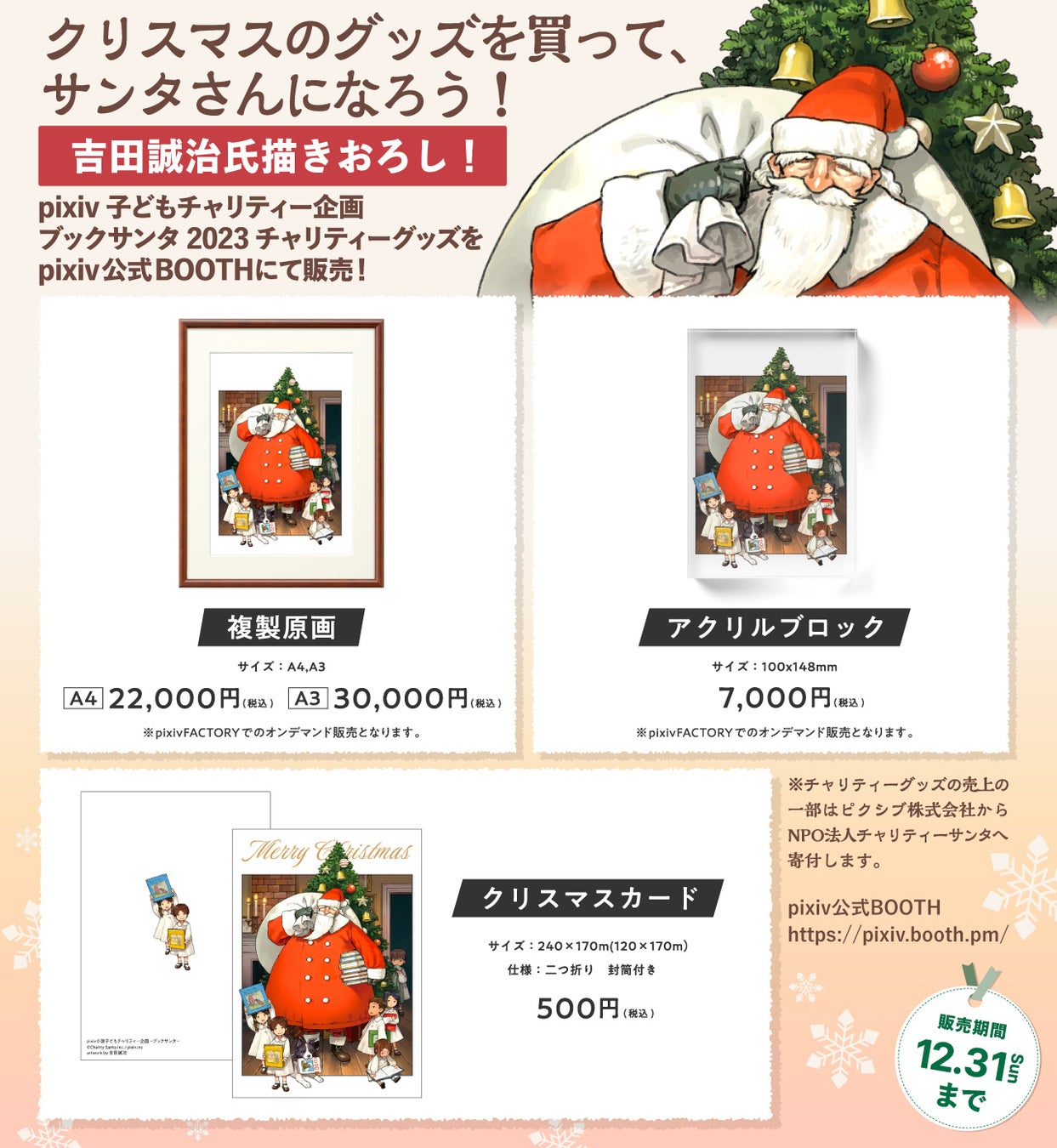 吉田誠治氏描きおろしイラストを使用したチャリティーグッズをpixiv公式BOOTHにて販売します。売上の一部をピクシブ株式会社からNPO法人チャリティーサンタへ寄付します。
