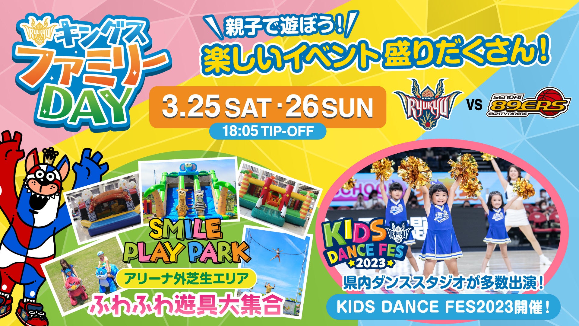 親子で楽しめるイベントがもりだくさんの「キングスファミリーDAY」。アリーナ外芝生エリアには、ふわふわ遊具が無料で遊べるSMILE PLAY PARKが登場!さらに26日(日)の試合前には県内ダンススタジオが多数出演するKIDS DANCE FES 2023を初開催!春休み最後の週末は、キングスのホームゲームで思い出をつくりましょう!
