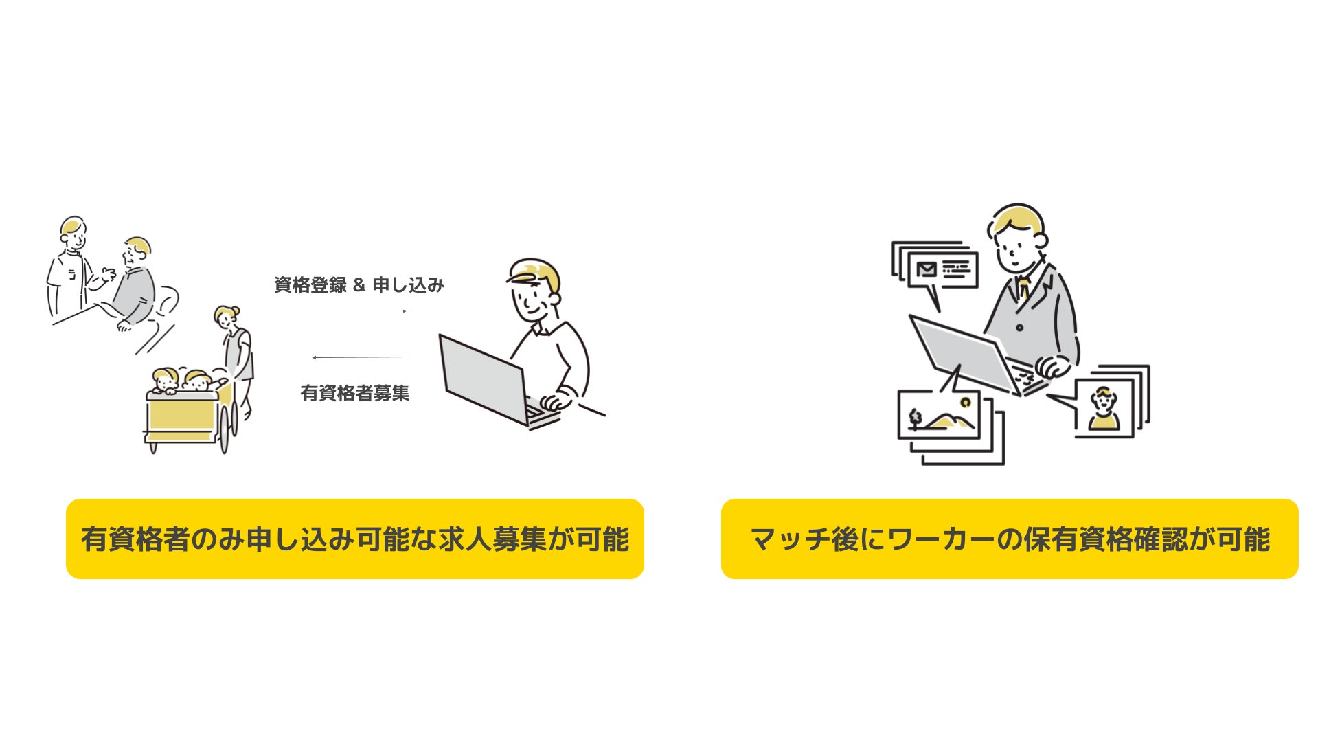 本機能の搭載により、潜在的な有資格者の掘り起こしの活性化および介護分野等専門性が高い業務におけるスポットワーカーのさらなる活躍を後押ししてまいります。