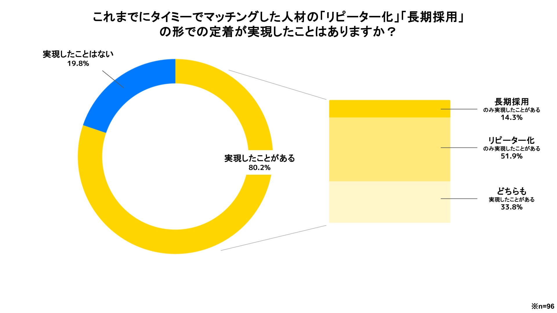 これまでにタイミーでマッチングした人材の定着に関する問いにおいては、「実現したことがある」と回答した事業所が80.2%という結果に。そのうち、「リピーター化」のみ実現した事業所は51.9%、「長期採用」のみ実現した事業所は14.3%、「リピーター化」「長期採用」どちらも実現したことがあるとした事業所は33.8%という結果になりました。多くの事業所においてスポットワーカーの定着が実現していることが見受けられます。
