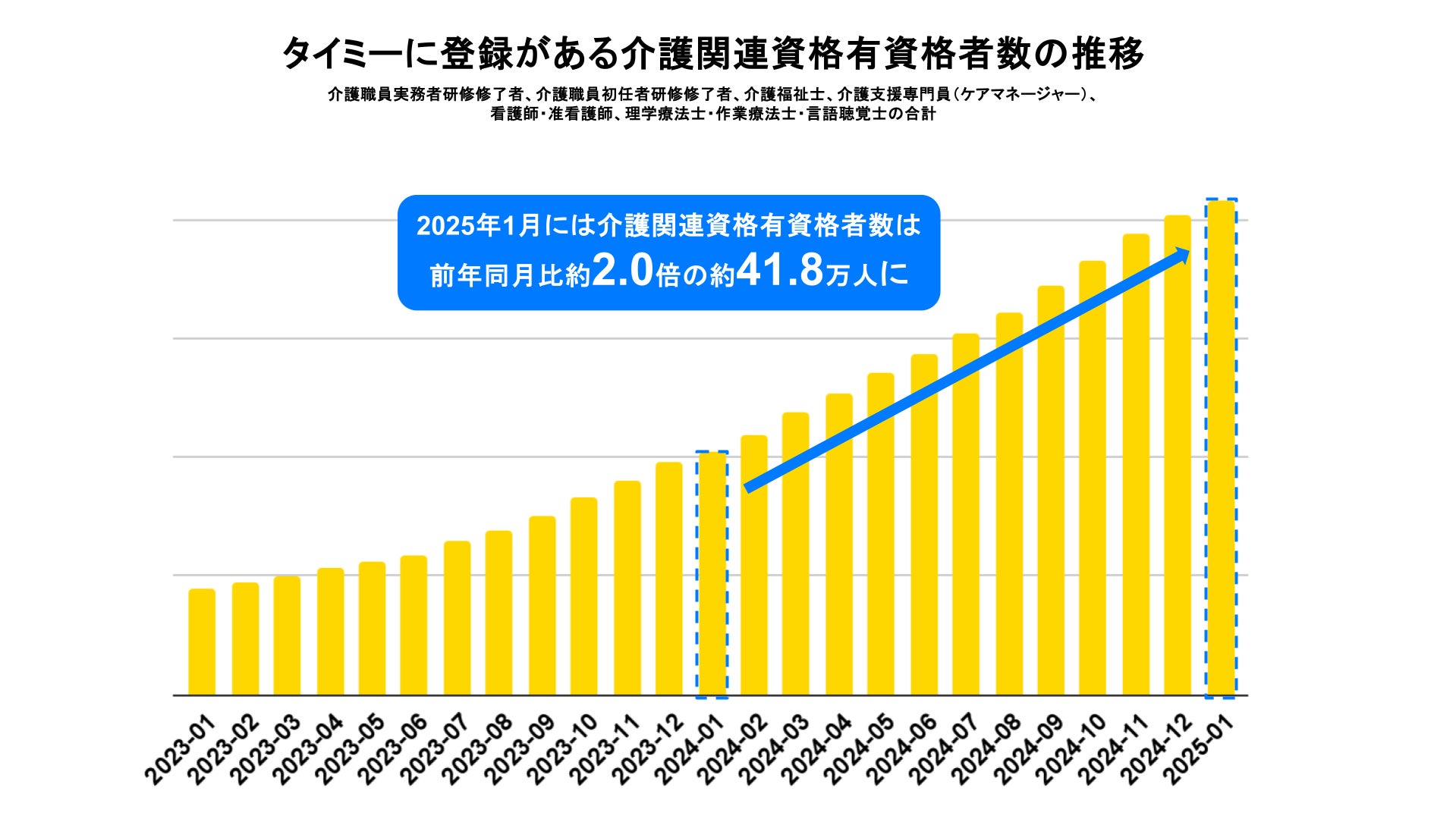 介護業界のタイミー募集人数(2025年1月時点)は、前年同月比約3.6倍に。また、ワーカーにおける介護有資格者は、2025年1月に前年同月比約2.0倍の約41.8万人を突破。
