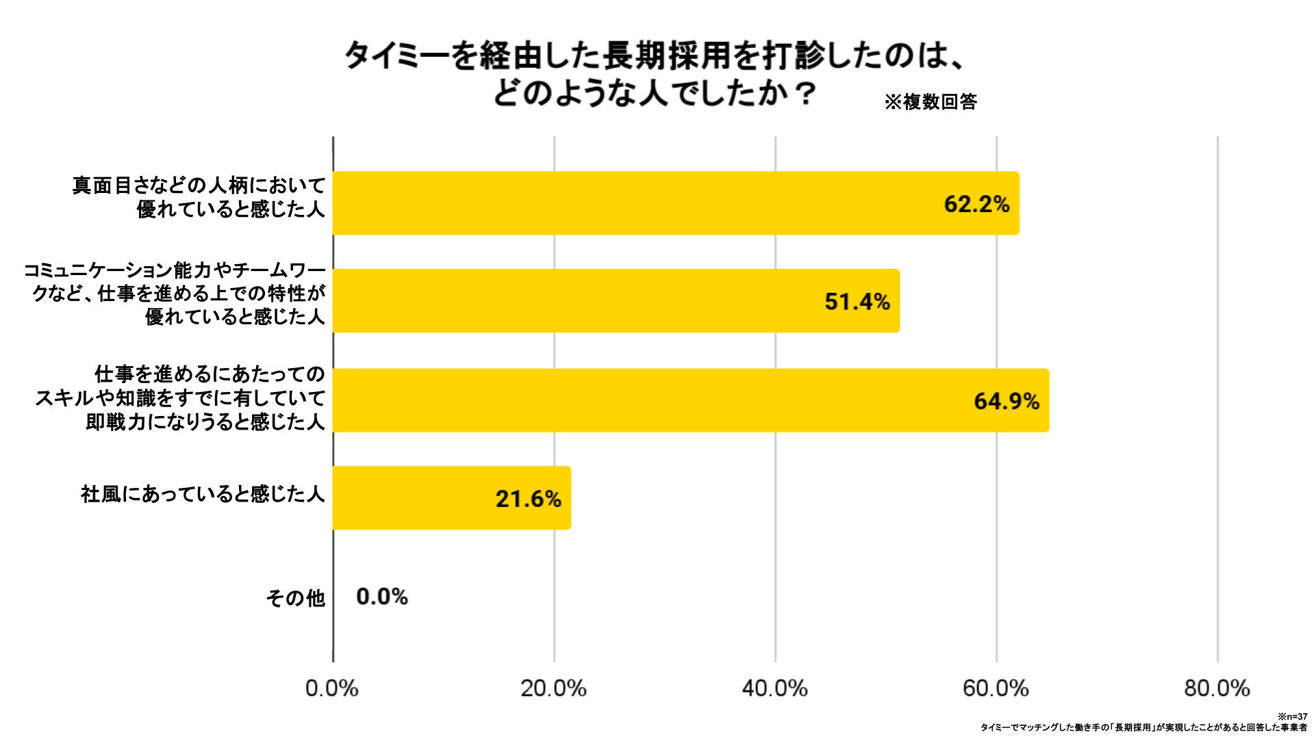 ※5:「これまでにタイミーでマッチングした人材の「リピーター化」「長期採用」が実現したことはありますか?」の問いに対し、「長期採用が実現したことがある」と回答した事業所。