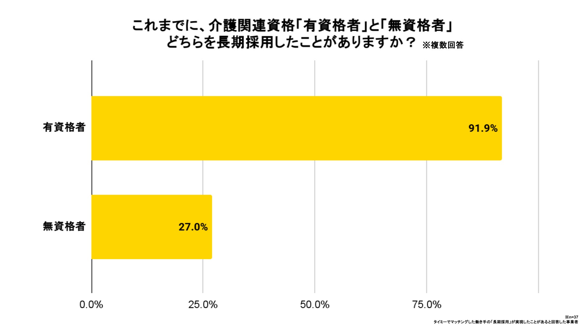 また、有資格者と無資格者どちらを長期採用したかの問いにおいては、有資格者が91.9%と、無資格者の割合(27.0%)と大差をつけました。