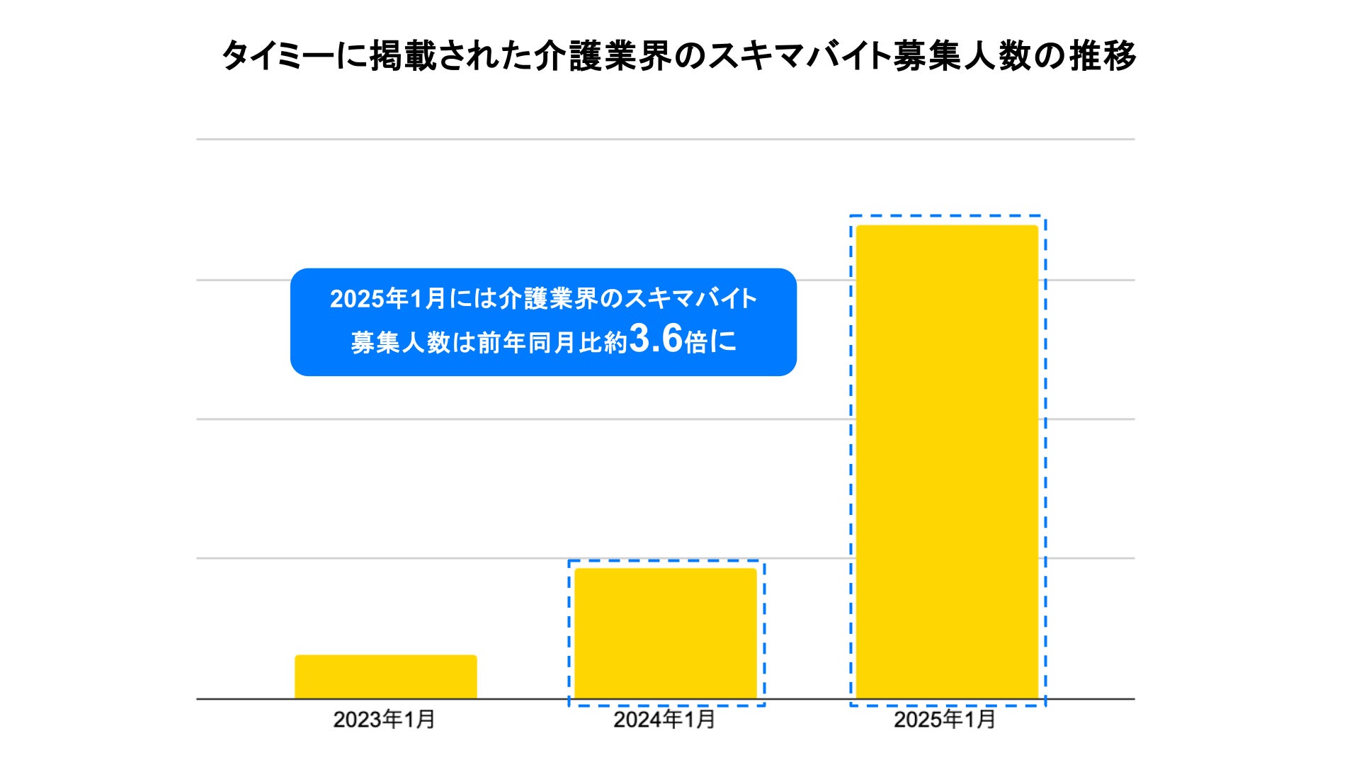 このような中、介護業界でのタイミー利用はここ数年で大きく広がり、介護業界の募集人数(2025年1月時点)は、前年同月比約3.6倍になりました。