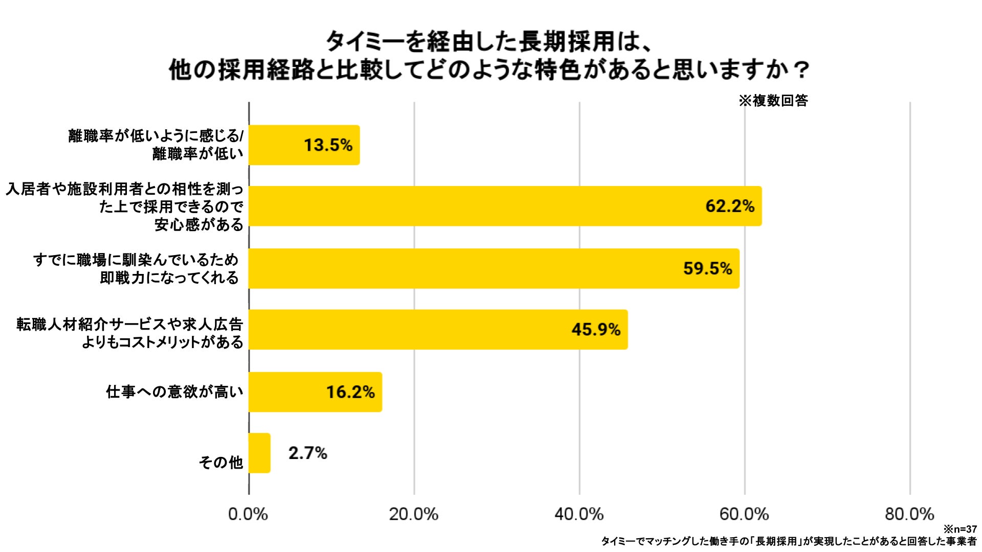 他採用経路と比較した際のタイミーを経由した長期採用の特色についてを聞いた問いにおいては、「入居者や施設利用者との相性を測った上で採用できるので安心感がある」が62.2%と最多となり、次点が「すでに職場に馴染んでいるため即戦力になってくれる」で59.5%という結果になりました。