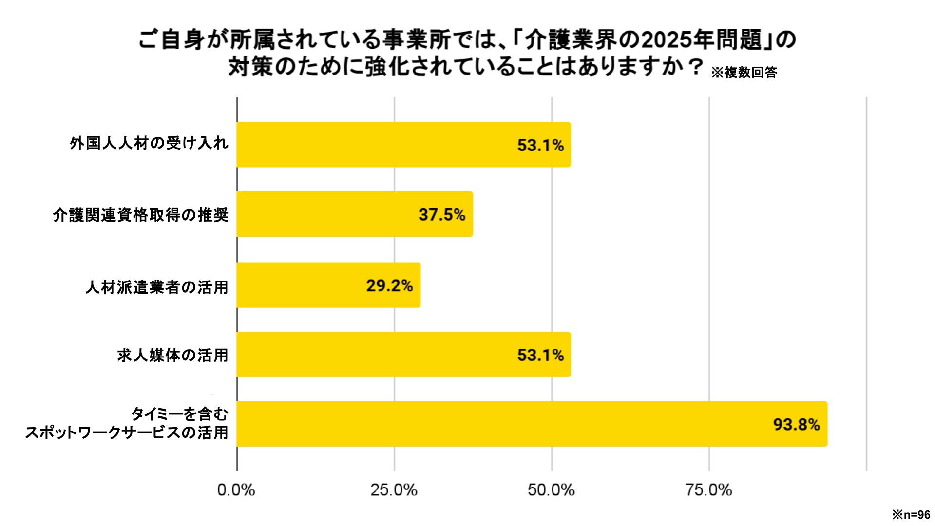 アンケートでは、94.8%の事業所が「『介護業界の2025年問題』を実感している」と回答。その対策としては「タイミーを含むスポットワークサービスの活用が最も多くの票を集め(93.8%)、「外国人人材の受け入れ(53.1%)」「求人媒体の活用(53.1%)」が続きます。