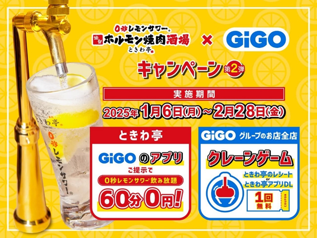 GOSSO株式会社(本社:東京都渋谷区、代表取締役:藤田建、以下 当社)は、「0秒レモンサワー®仙台ホルモン焼肉酒場 ときわ亭」(一部店舗を除く)にて、アミューズメント施設「GiGO」を展開する株式会社GENDA GiGO Entertainment(本社:東京都港区、代表取締役:二宮一浩)主催のコラボレーションキャンペーンを、2025年1月6日(月)から2月28日(金)までの期間限定で開催します。