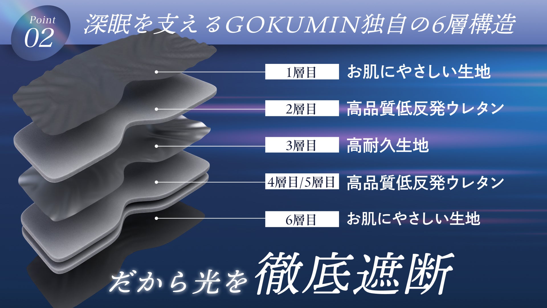 寝ているのに疲れが取れない悩みに、光からのアプローチ。徹底遮光設計で、目元から睡眠環境を整える。(https://gokumin.co.jp/products/g-e3d-bk-01)