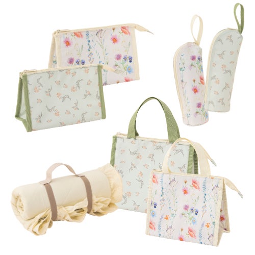 繊細なタッチで描かれた可憐な花柄のランチバッグ。落ち着いたセージグリーンと柔らかなアイボリーが大人かわいいピクニック空間を演出してくれます。
