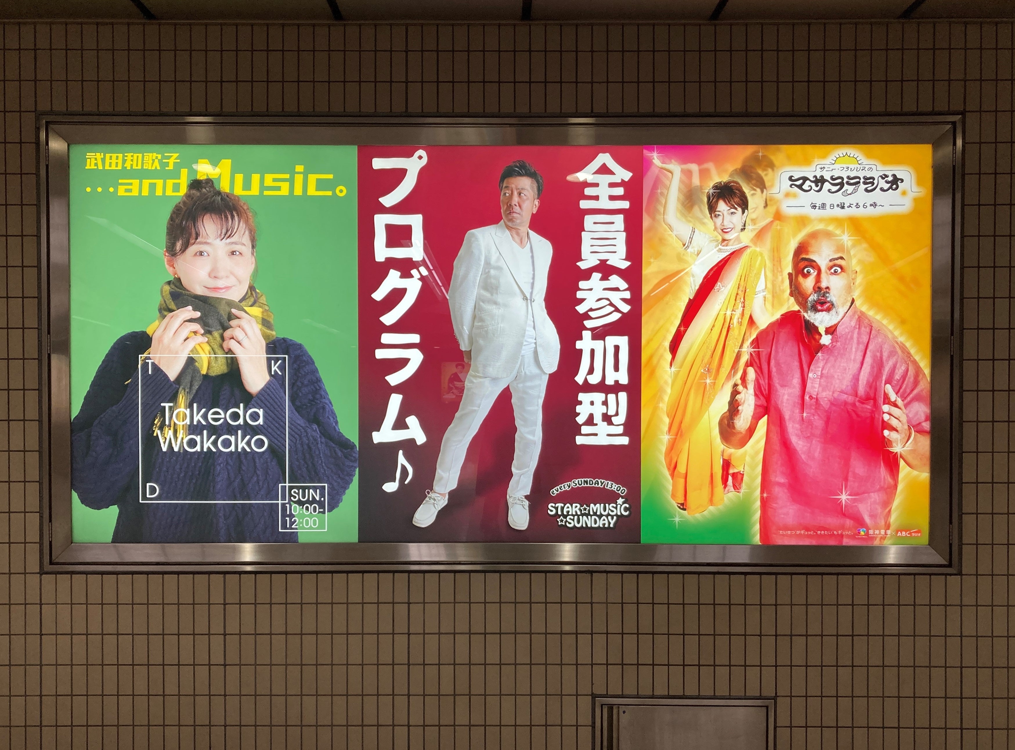さらに改札階にはABCラジオの番組ポスタービジュアルを装飾。色とりどりなポスターがずらりと並ぶ。