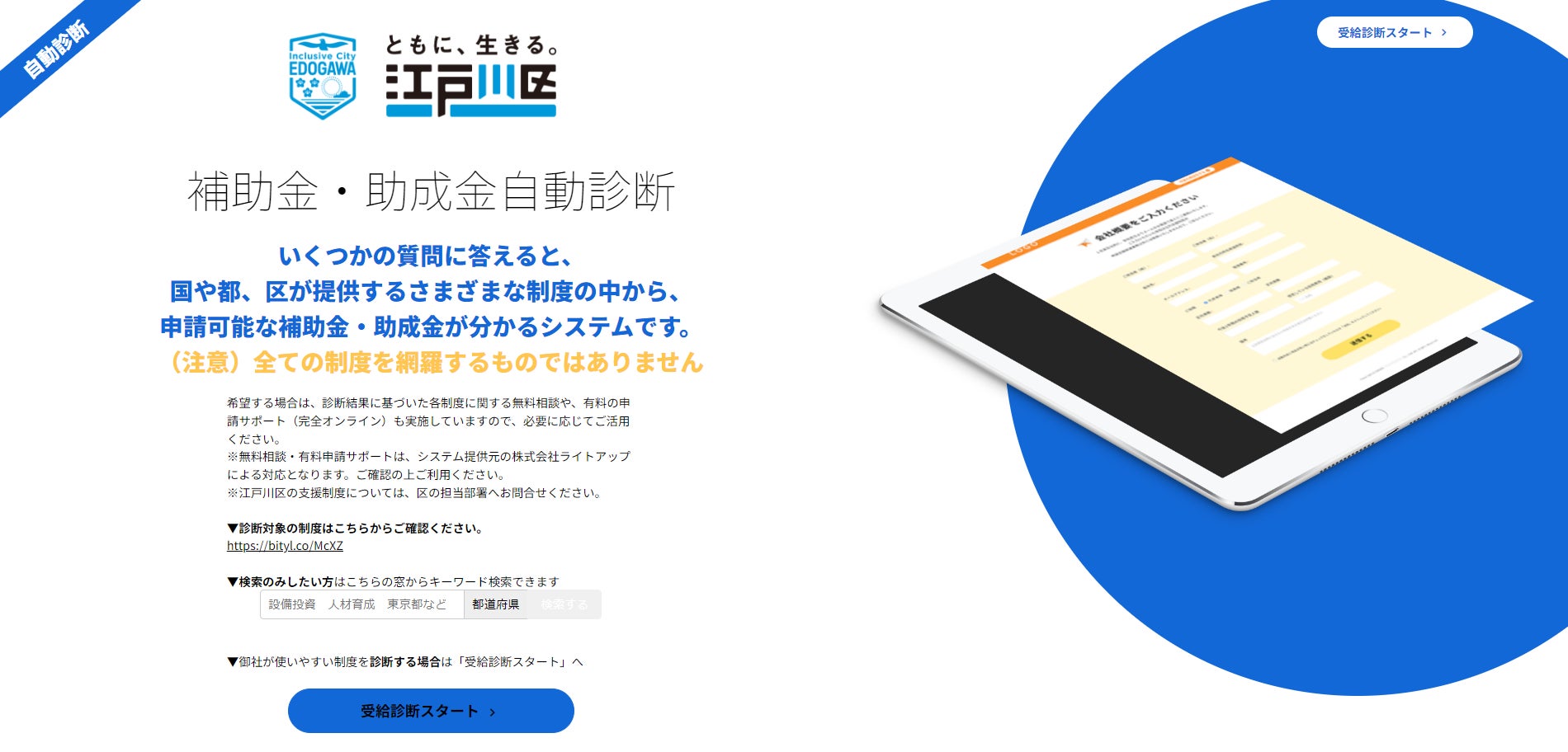 【24自治体目】ライトアップ、江戸川区へ「Jシステム(補助金・助成金自動診断システム)」を提供開始。区内事業者に向けた情報提供を充実