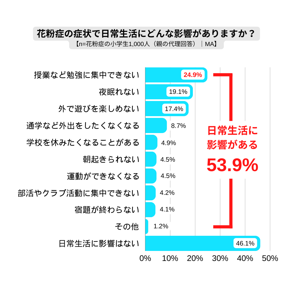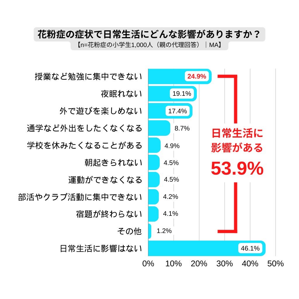 花粉症によって53.9%が「勉強に集中できない」など生活に影響がある