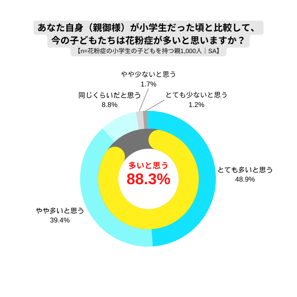 親自身が小学生だった頃と比較して、88.3%が「今の子の方が花粉症が多い」