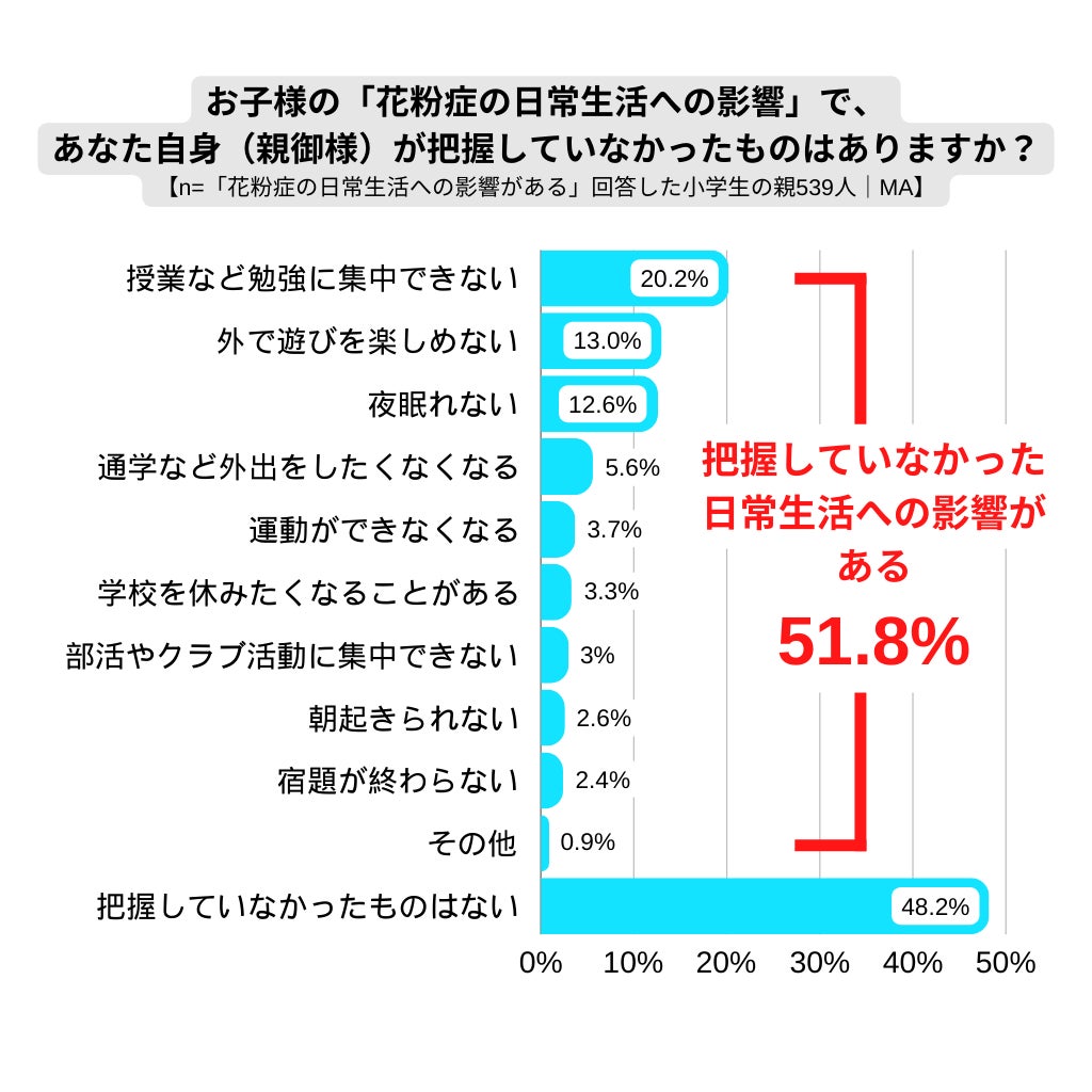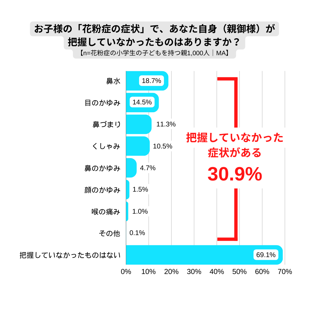 このアンケート調査を通して、花粉症の子どもが感じている症状のうち把握していない症状があった親は30.9%でした。また、花粉症の子どもが感じている「日常生活への影響」のうち把握していないものがあった親は51.8%にのぼりました。一緒に暮らしていても、子どもが「鼻水」や「目のかゆみ」を感じていること、また実は花粉症のせいで勉強や遊びに全力投球できなかったり、夜によく眠れていないことに親が気づいていない現象が発生しているようです。