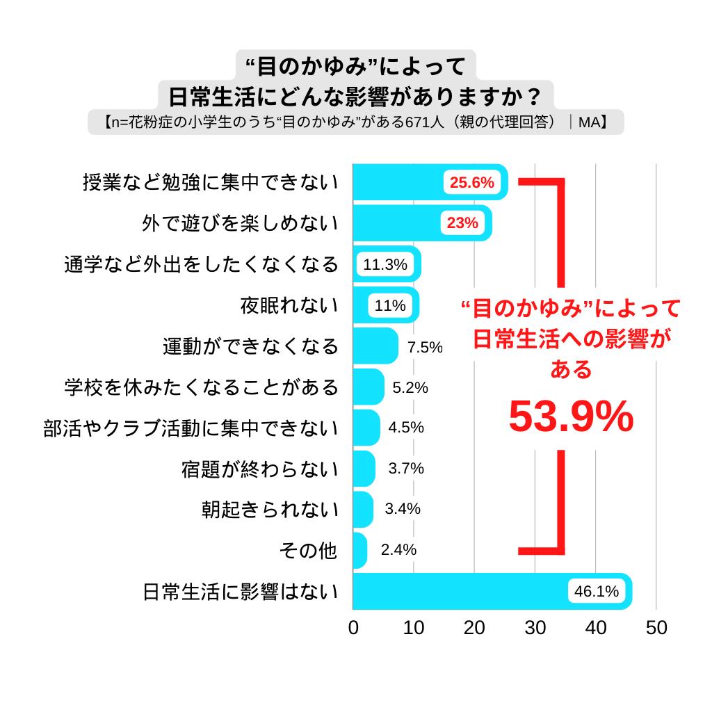花粉症を実感する小学生が感じる症状の2位だった「目のかゆみ」フォーカスしてみると、“目のかゆみ”によって日常生活に何らかの影響がある小学生は53.9%にのぼり、具体的には1位「授業など勉強に集中できない」25.6%、2位「外で遊びを楽しめない」23%でした。また子どもの“目のかゆみ”による日常生活への影響のうち把握していないものがあった親は44.2%でした。花粉症の症状のなかでも、“目のかゆみ”は小学生の本分である勉強や遊びに深刻な影響を与えていること、また意外にそれに親が気付いてないケースがあることがわかりました。
