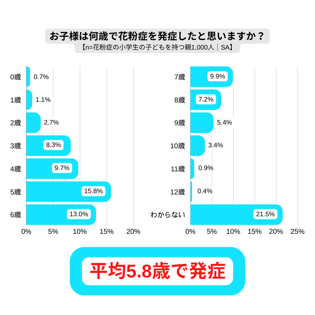 対象を小学生に絞るとおよそ半数にあたる47.4%が花粉症を実感しているという結果になりました。また発症した年齢は平均5.8歳で、小学校にあがる前から花粉症を発症しているケースも多いようです。