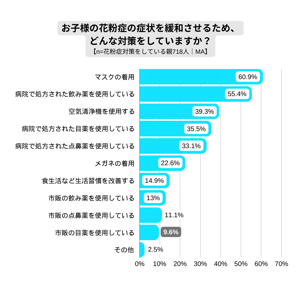 花粉症対策をしている親がしていることの1位は「マスクの着用」60.9%、2位は「病院で処方された飲み薬の使用」55.4%でした。一方で花粉症の小学生が感じる症状の2位だった「目のかゆみ」へのピンポイントな対策はやや優先度が低いようで、「病院で処方された目薬の使用」35.5%が4位、「メガネの使用」22.6%が6位、「市販の目薬の使用」に至っては9.6%で選択肢の中で最下位でした。
