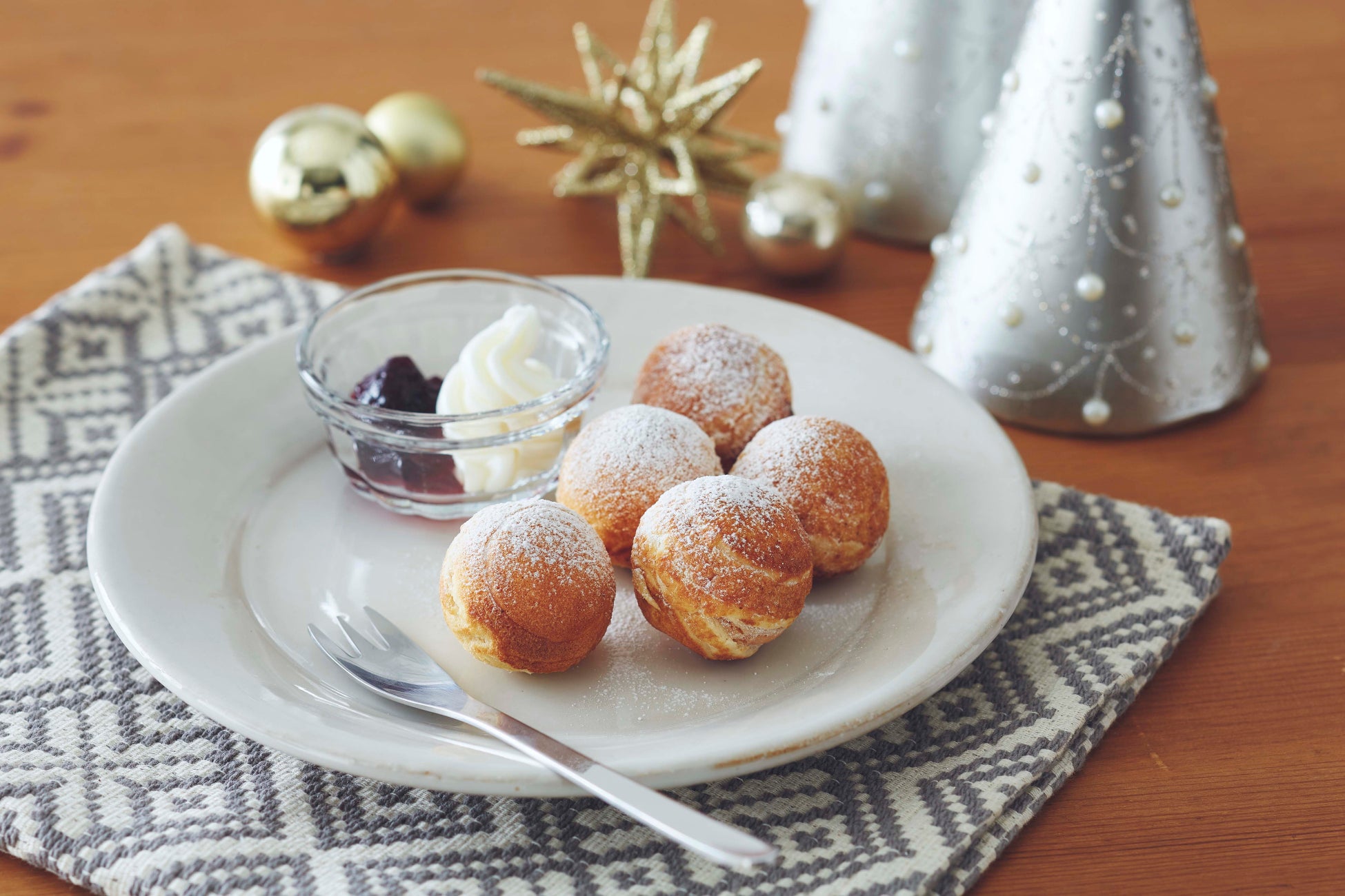 クリスマス前に食べられるデンマークの伝統料理のひとつ。甘さ控えめの丸いパンケーキに、甘酸っぱいブルーベリーのジャムとホイップクリームをたっぷりつけて食べるのが現地流。