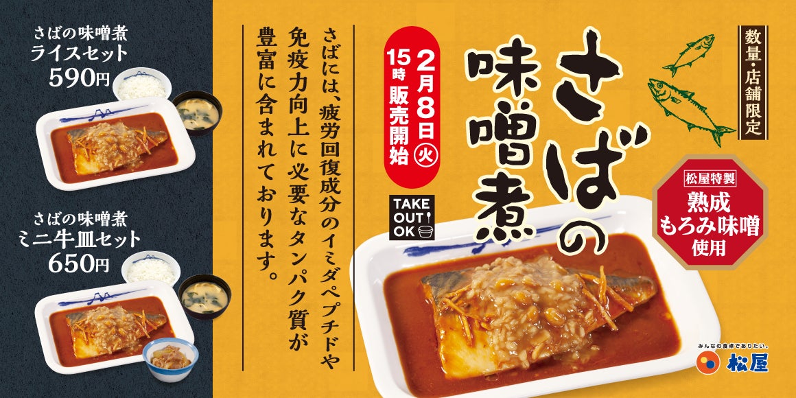 このたび松屋フーズ(本社:東京都武蔵野市、代表取締役社長:瓦葺一利)では、牛めし・カレー・定食・その他丼の「松屋」におきまして、2022年2月8日(火)午後3時より「さばの味噌煮」を発売いたします。