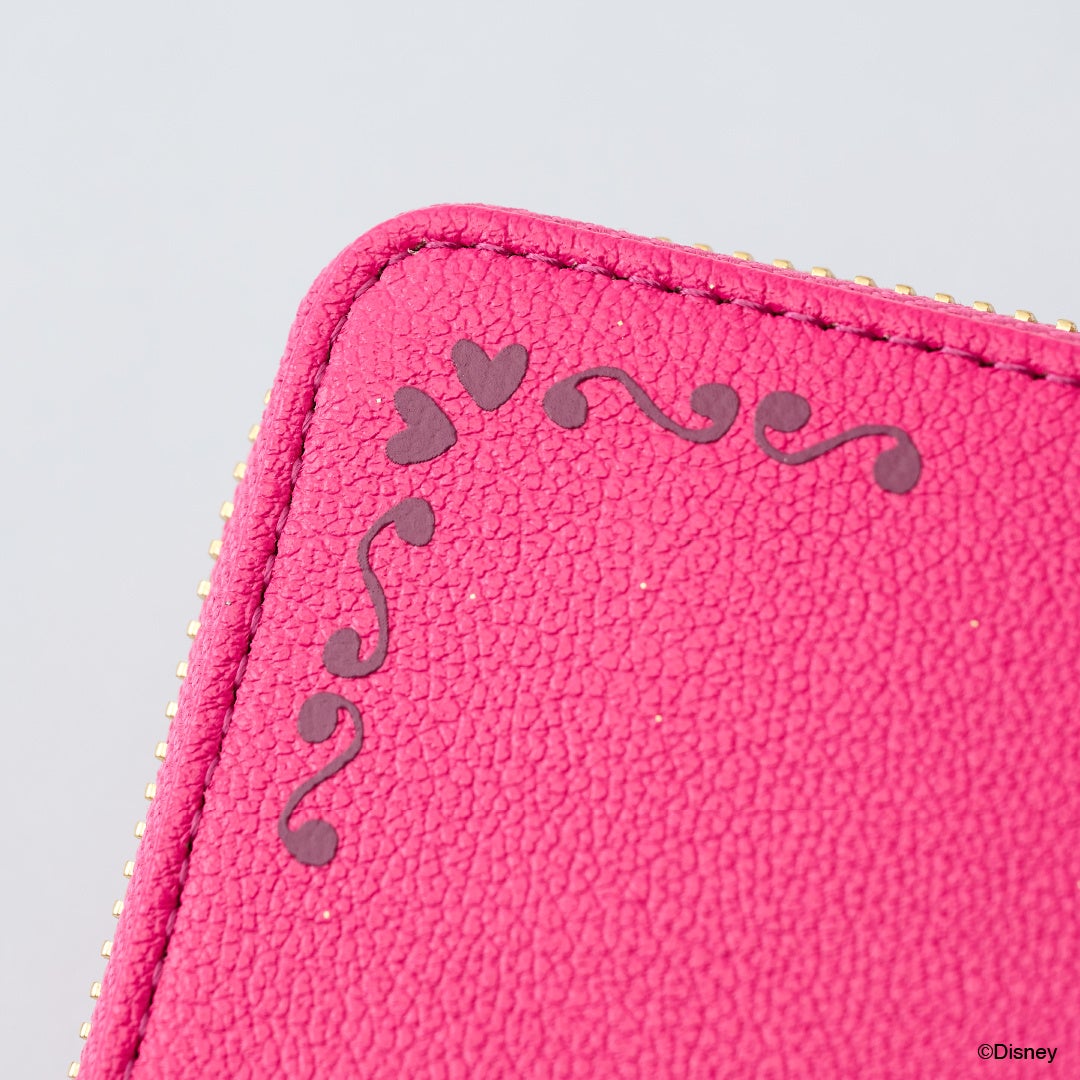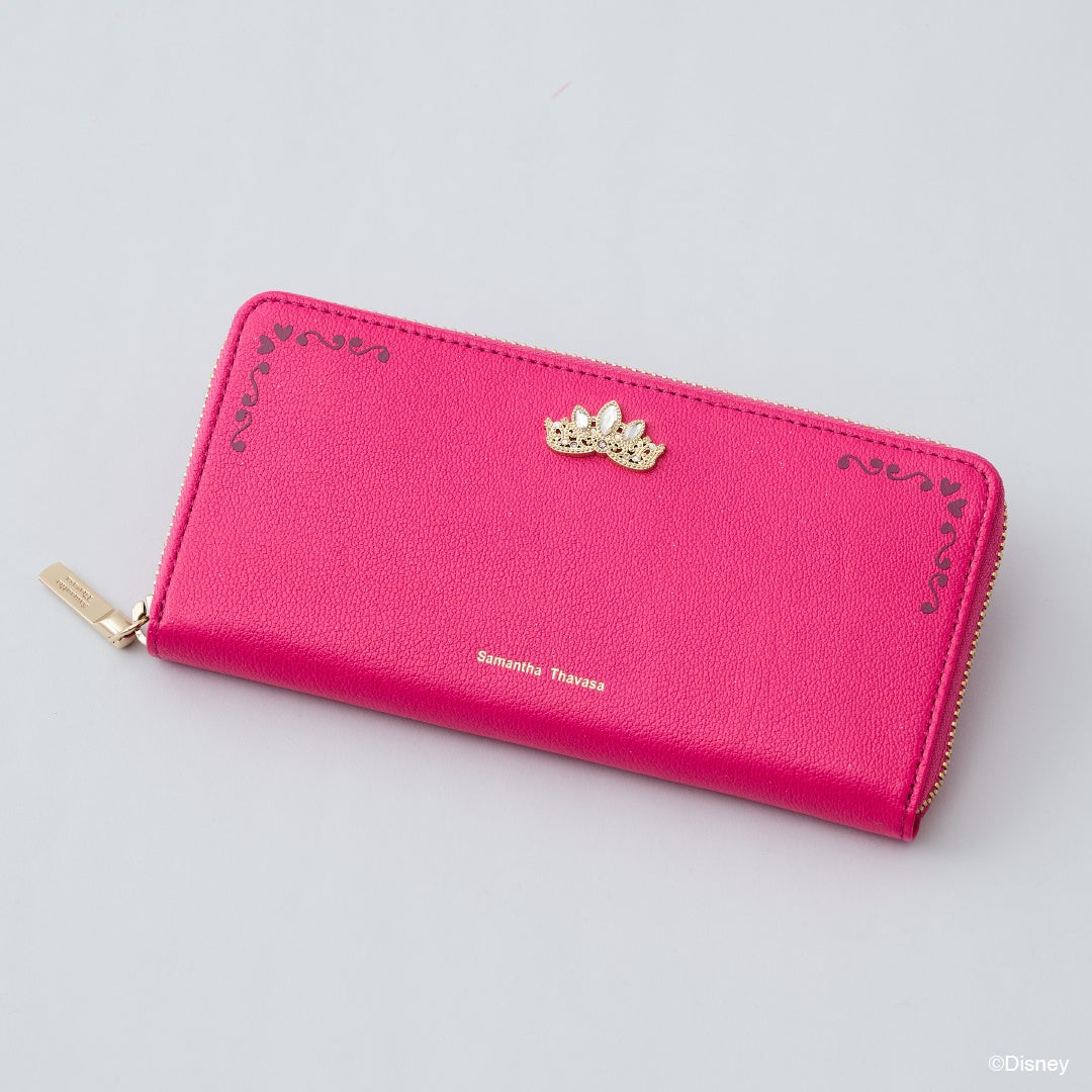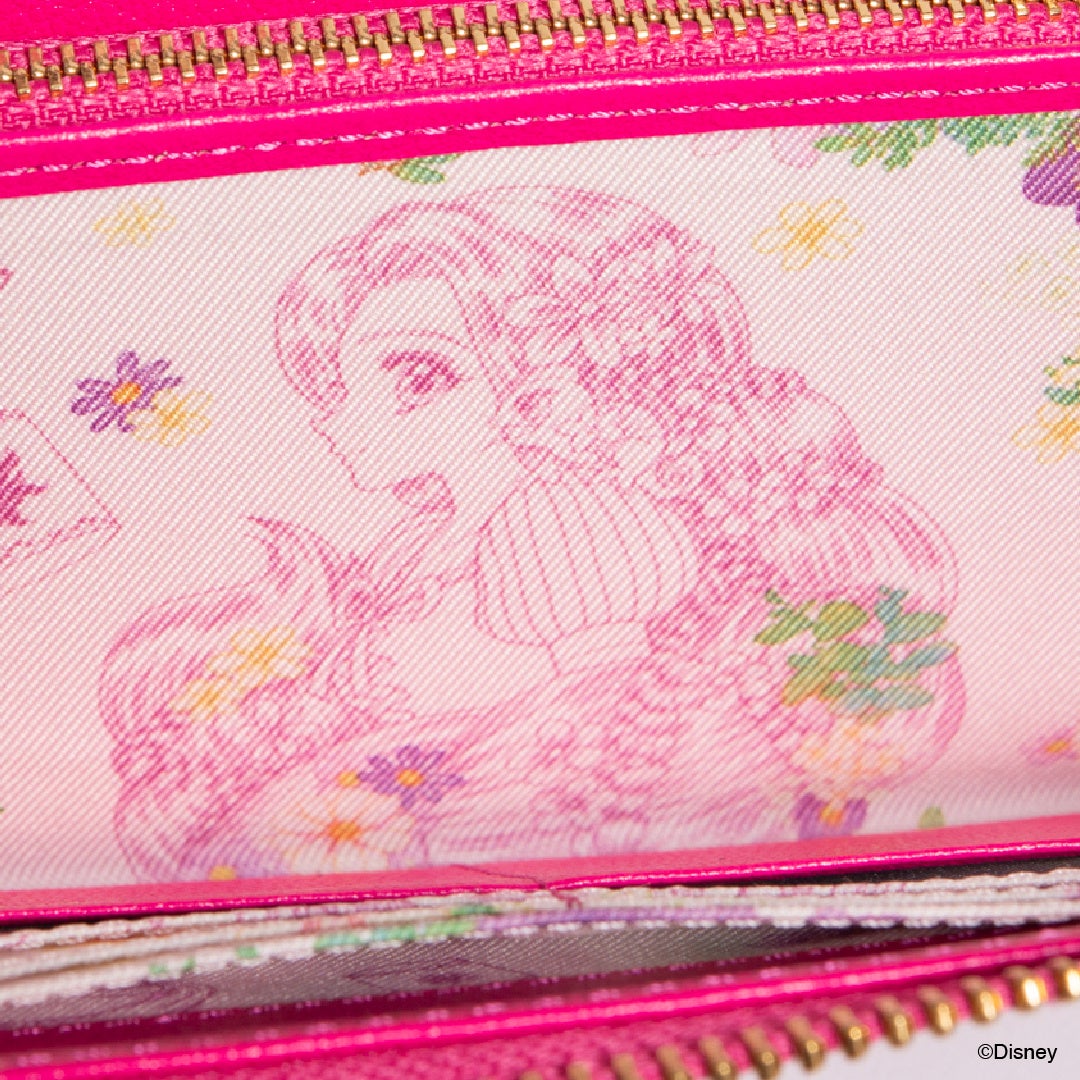 「ラプンツェル」のティアラを連想させるモチーフをデザインしたピンクの長財布は、背面には線画で表現された「ラプンツェル」のアートが。繊細に描かれたアートや世界観溢れるモチーフに注目。