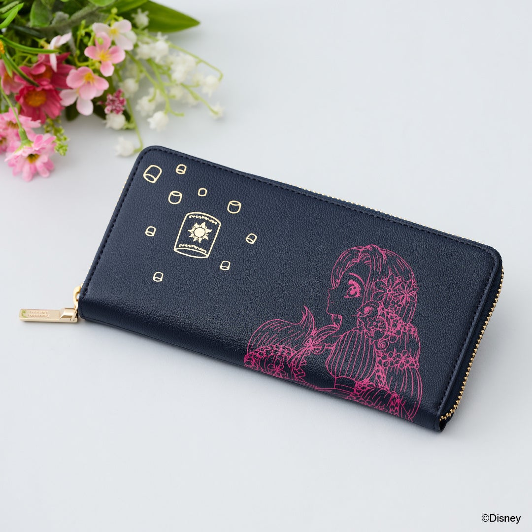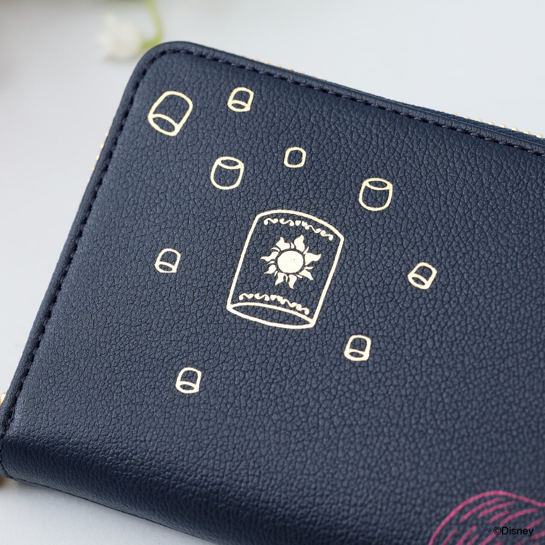 ゴールドの箔押しでデザインされたランタンを眺める「ラプンツェル」の姿が印象的なネイビーの長財布は、ロマンティックな映画のシーンを連想させるデザインに。