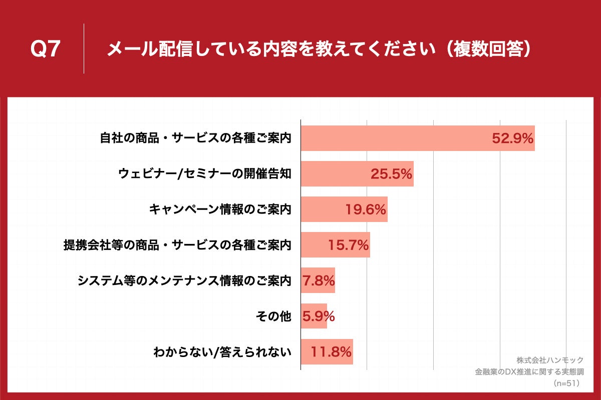 「Q7.Q5で「はい」と回答した方に、メール配信している内容を教えてください(複数回答)」(n=51)と質問したところ、「自社の商品・サービスの各種ご案内」が52.9%、「ウェビナー/セミナーの開催告知」が25.5%、「キャンペーン情報のご案内」が19.6%という回答となりました。