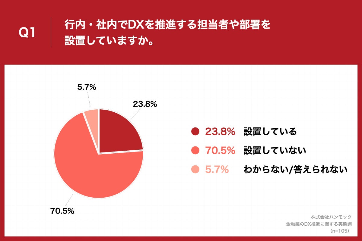 「Q1.行内・社内でDXを推進する担当者や部署を設置していますか。」(n=105)と質問したところ、「設置している」が23.8%という回答となりました。