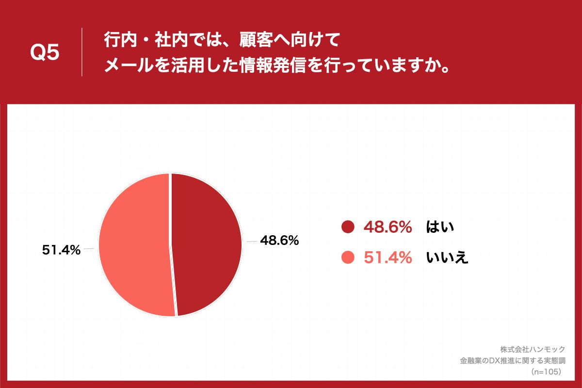 「Q5.行内・社内では、顧客へ向けてメールを活用した情報発信を行っていますか。」(n=105)と質問したところ、「はい」が48.6%、「いいえ」が51.4%という回答となりました。