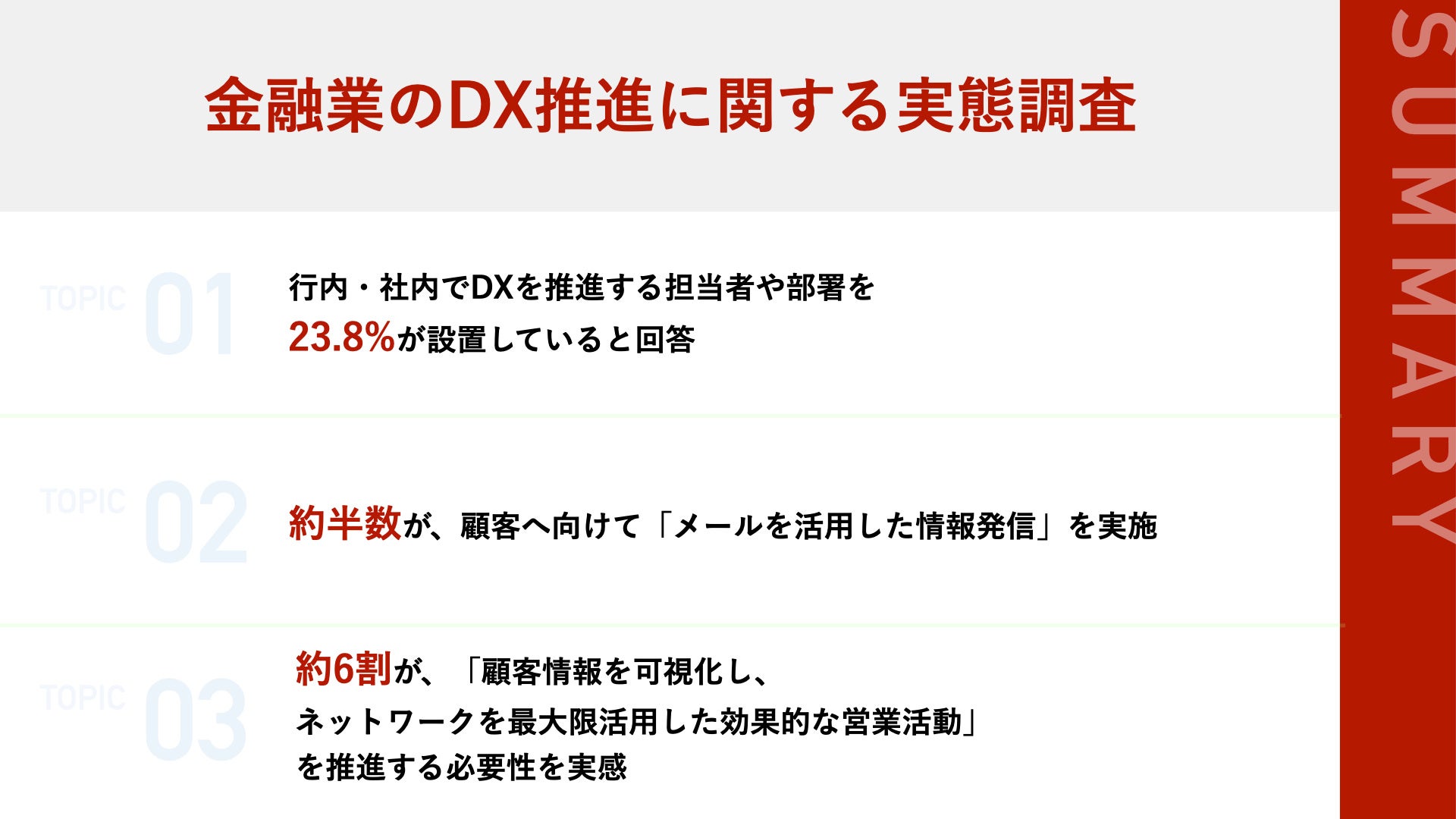 今回は、金融業の経営者・役員105名を対象に、金融業のDX推進に関する実態調査を実施しました。