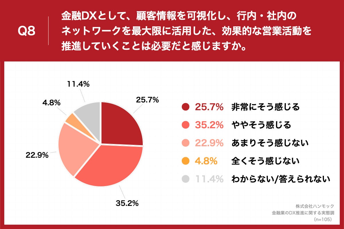 「Q8.金融DXとして、顧客情報を可視化し、行内・社内のネットワークを最大限に活用した、効果的な営業活動を推進していくことは必要だと感じますか。」(n=105)と質問したところ、「非常にそう感じる」が25.7%、「ややそう感じる」が35.2%という回答となりました。