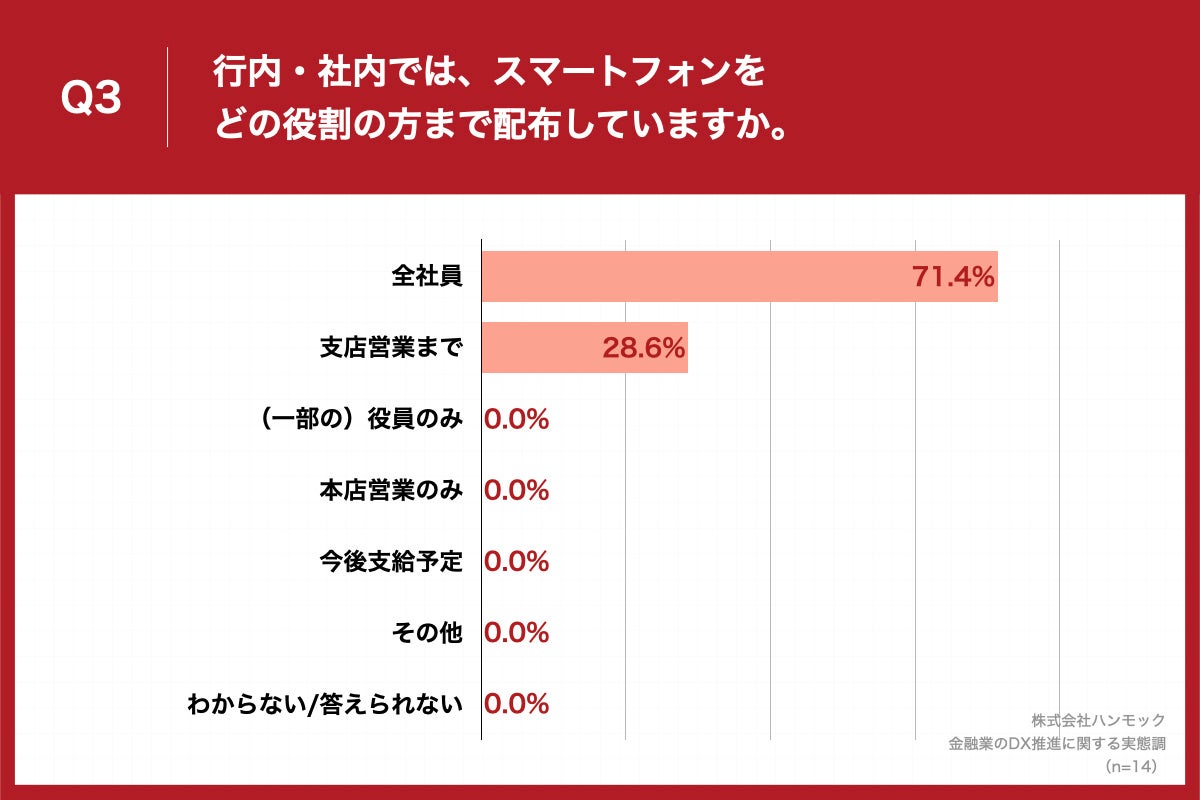 「Q3.Q2で「従業員向けのスマートフォンの支給」と回答した方に、行内・社内では、スマートフォンをどの役割の方まで配布していますか。」(n=14)と質問したところ、「全社員」が71.4%、「支店営業まで」が28.6%という回答となりました。