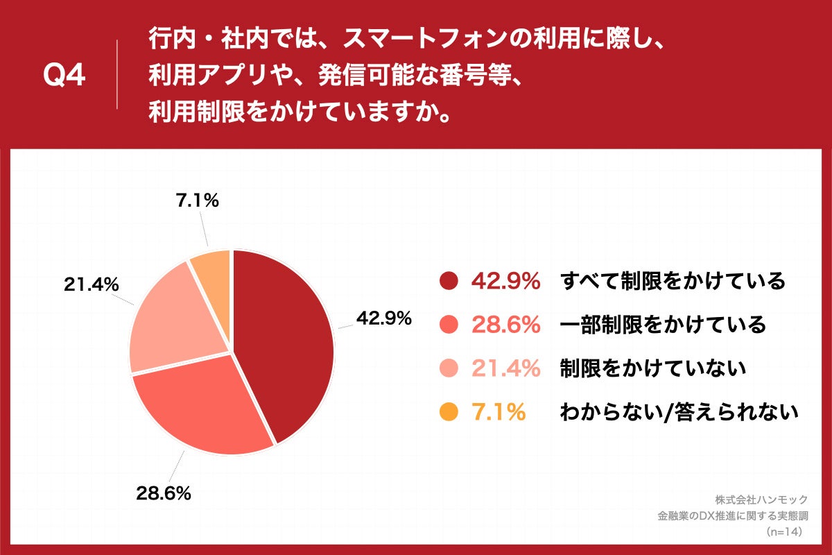 「Q4.Q2で「従業員向けのスマートフォンの支給」と回答した方に、行内・社内では、スマートフォンの利用に際し、利用アプリや、発信可能な番号等、利用制限をかけていますか。」(n=14)と質問したところ、「すべて制限をかけている」が42.9%、「一部制限をかけている」が28.6%という回答となりました。