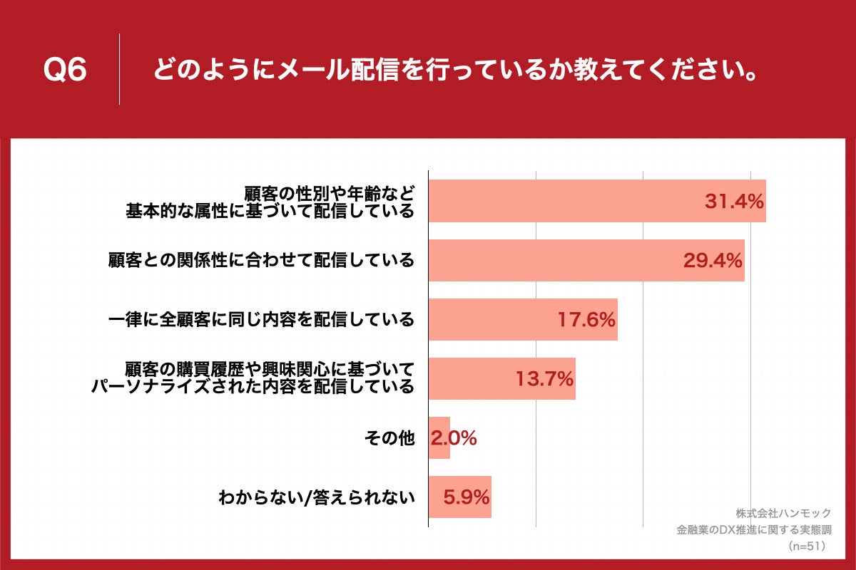 「Q6.Q5で「はい」と回答した方に、どのようにメール配信を行っているか教えてください。」(n=51)と質問したところ、「顧客の性別や年齢など基本的な属性に基づいて配信している」が31.4%、「顧客との関係性に合わせて配信している」が29.4%、「一律に全顧客に同じ内容を配信している」が17.6%という回答となりました。
