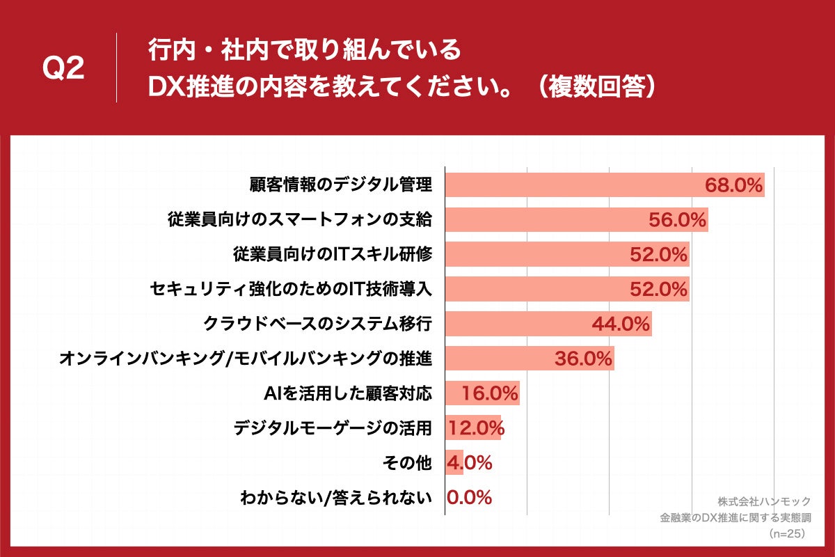 「Q2.Q1で「設置している」と回答した方に、行内・社内で取り組んでいるDX推進の内容を教えてください。(複数回答)」(n=25)と質問したところ、「顧客情報のデジタル管理」が68.0%、「従業員向けのスマートフォンの支給」が56.0%という回答となりました。