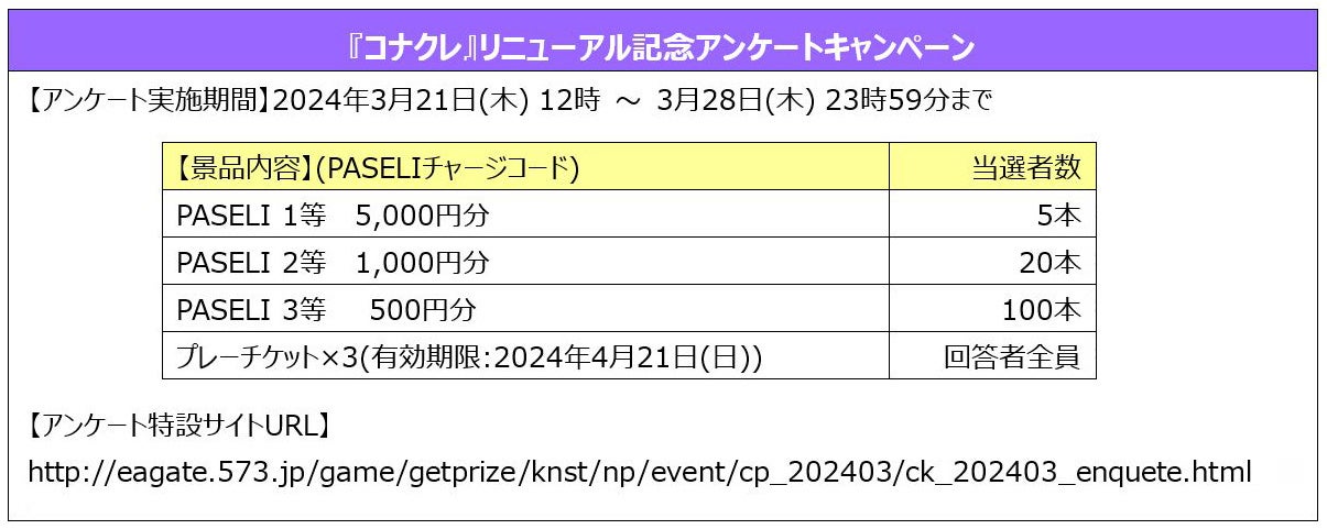 『コナクレ』をプレーいただいたお客さまを対象に「『コナクレ』リニューアル記念アンケートキャンペーン」を実施しています。回答者全員に「『コナクレ』プレーチケット3枚」 をプレゼントします。さらに、アンケートにお答えいただいた方から抽選で125名さまに最大5,000円分の「PASELIチャージコード」をプレゼントします。たくさんのご要望・ご意見お待ちしております。
