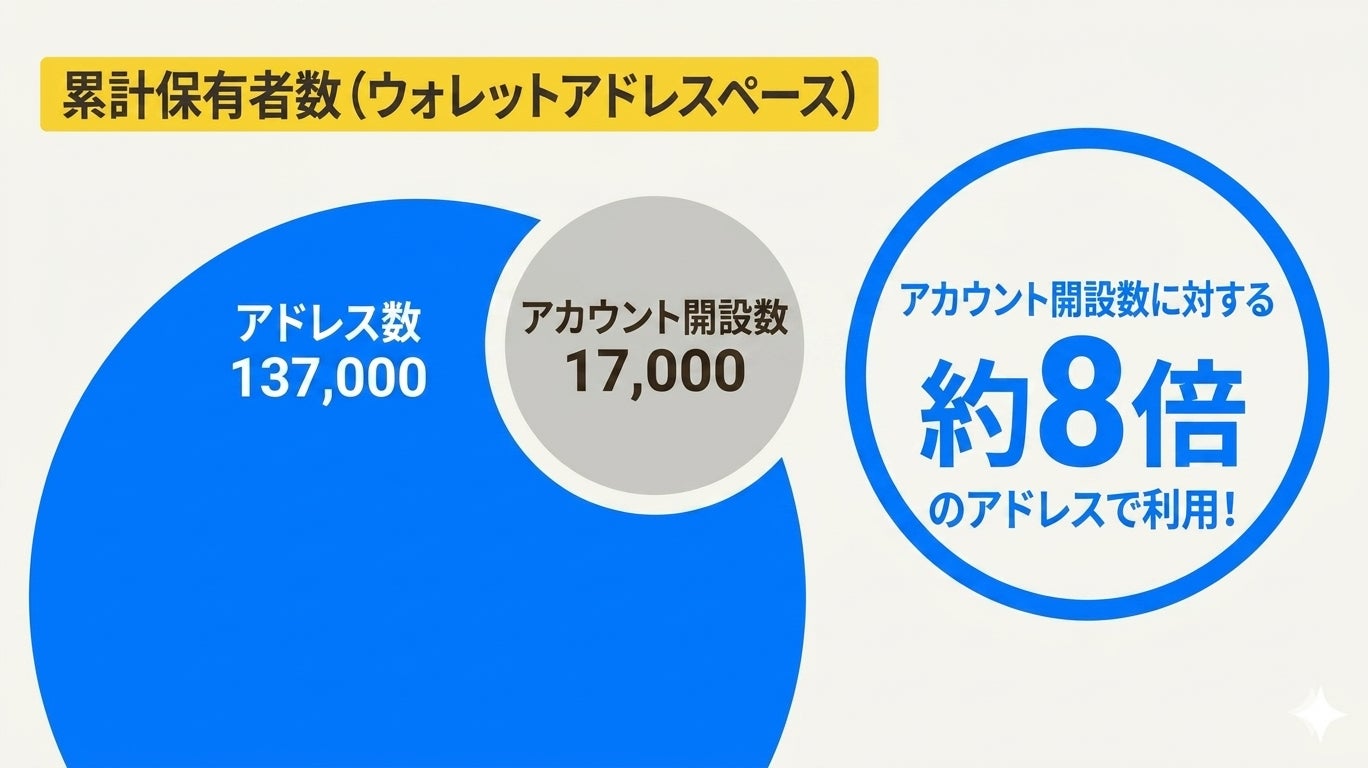 当社の直接アカウント開設数は17,000件ですが、実際に「JPYC」を保有したことがあるウォレットアドレス数はその約8倍にあたる137,000アドレスを突破しました。 これは、当社でアカウント開設をしていないユーザー間でも「JPYC」が流通していることを示しています。銀行口座を持たずともデジタル通貨を利用できるという、ブロックチェーンならではの「摩擦のない金融体験」が市場に受け入れられています。