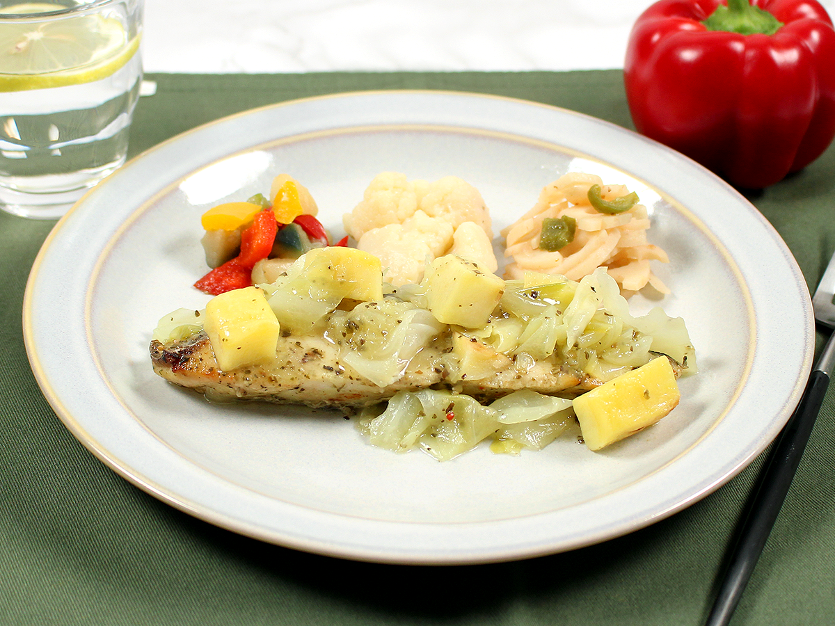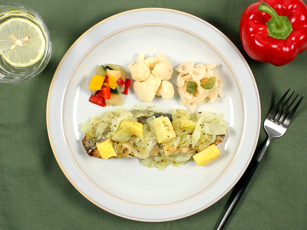 ローストした鰆(さわら)を、爽やかなバジルドレッシングで仕上げました。甘酸っぱい味付けのキャベツ、ホクホクしたじゃがいもと一緒にお召し上がりください。さっぱりと召し上がれるプレートとなっております。