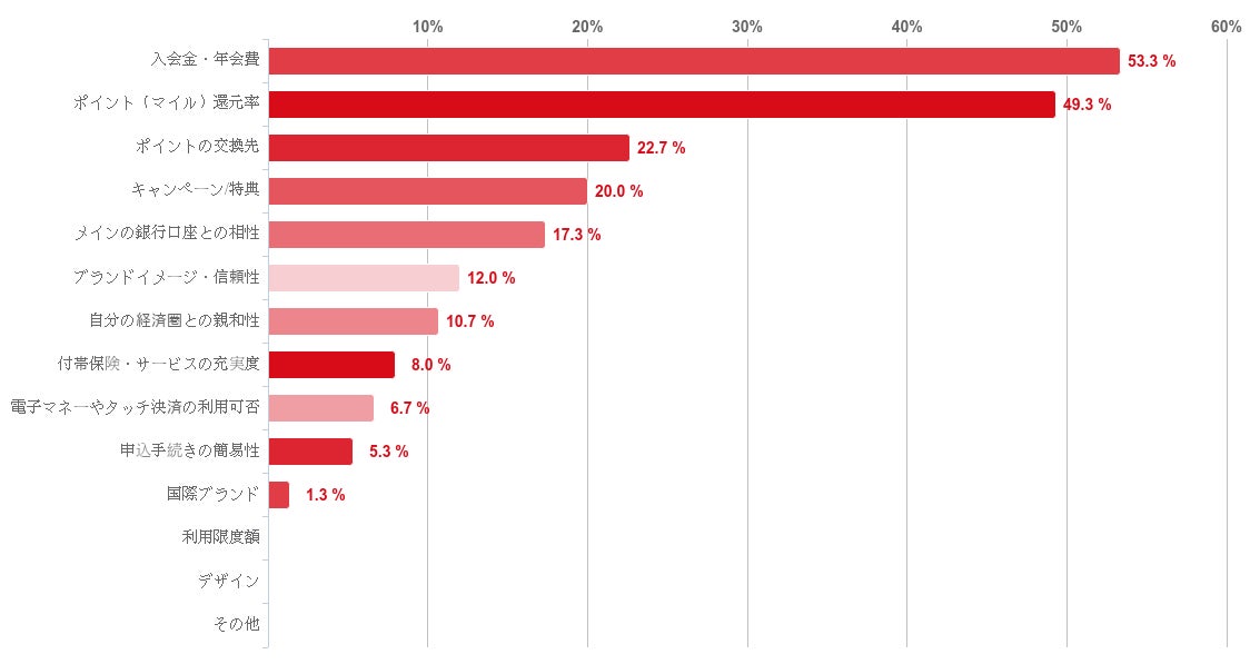 また、クレジットカードの選択には入会金・年会費やポイント(マイル)還元率などを特に重視する傾向が見られた。