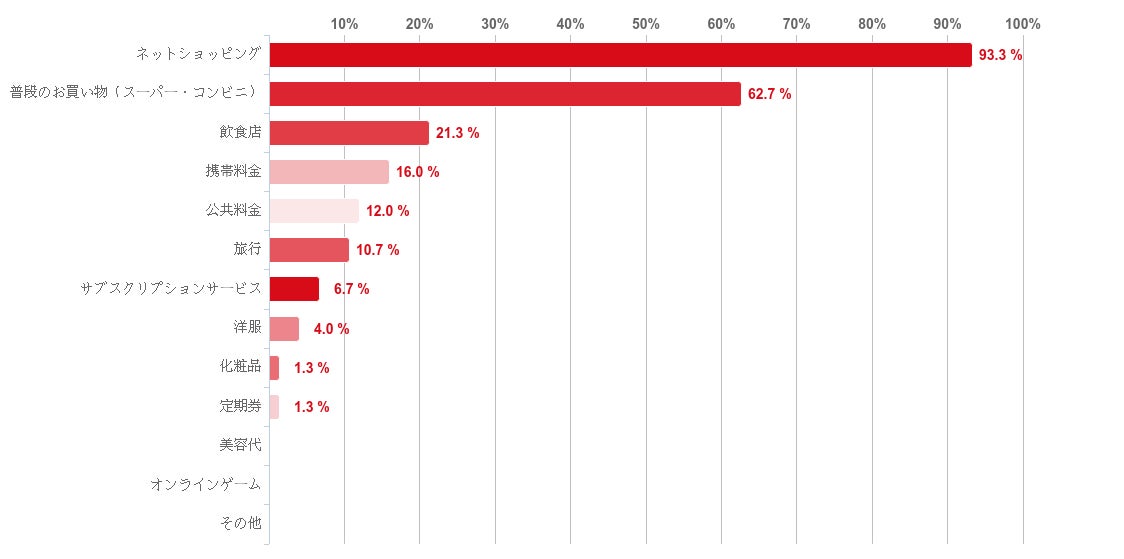 学生がクレジットカードを利用するのはネットショッピングが93.3%で最も多く、次に普段のお買い物(スーパー・コンビニ)が62.7%と続いた。