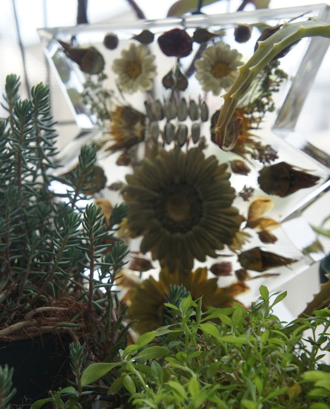 草花の造形の再構築により、通常とは違う物事の捉え方を表現しようとする試み。これらは物体なのか、もしくは生命体なのか。生き物としての草花がレジンの中でリミックスされ、立体化された作品の数々からイマジネーションが膨らみます。
