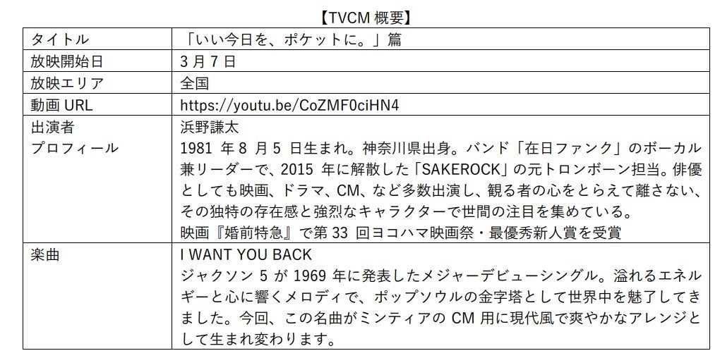 アサヒグループ食品株式会社(本社 東京、社長 川原浩)は、「ミンティア」ブランドの2025年の新コミュニケーションを「いい今日を、ポケットに。」とし、浜野謙太さんを起用した新CMを3月7日から放映します。