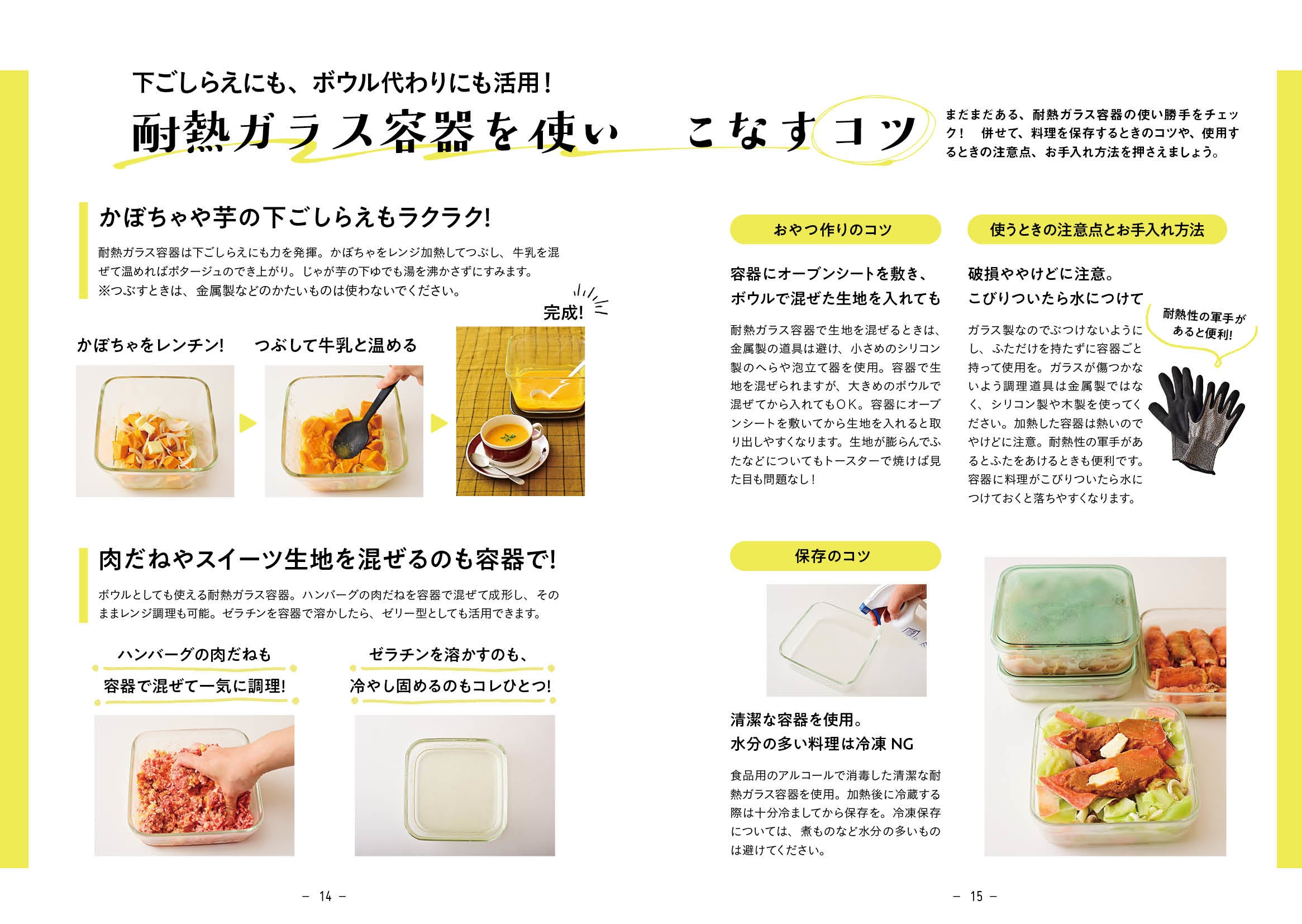 「耐熱ガラスの保存容器」は調理から保存、食卓、片づけまで活用できる優れもの。ガラスのため、見た目がスッキリとして、冷蔵庫の中でも中身が見えて保存に便利なのはもちろんですが、電子レンジとオーブンやトースターの両方の熱源が使えることが優秀なポイント。レシピは材料と調味料を入れ、混ぜ合わせて加熱するだけの手軽なものばかりを紹介しています。