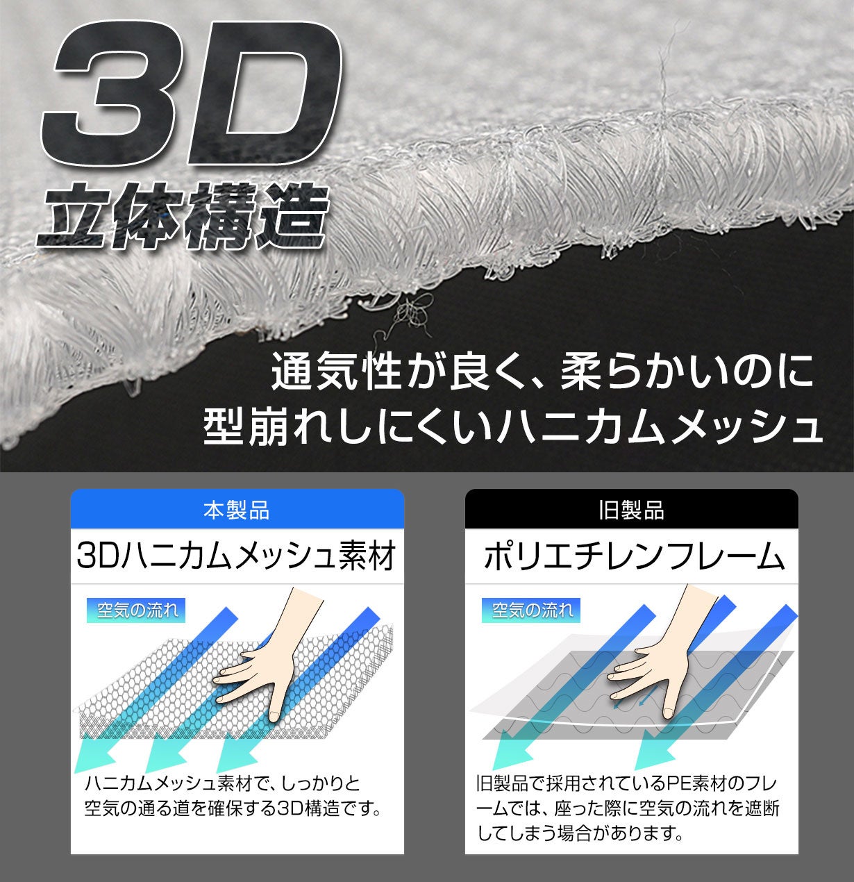 独自の立体構造を採用した3Dメッシュ素材により、座った状態でも空気の通り道をしっかり確保。旧来のPEフレーム製で課題だった「座ると風が遮断される」「お尻が痛くなる」といった不満を解消し、ソフトな座り心地と圧倒的な通気性を両立しました。