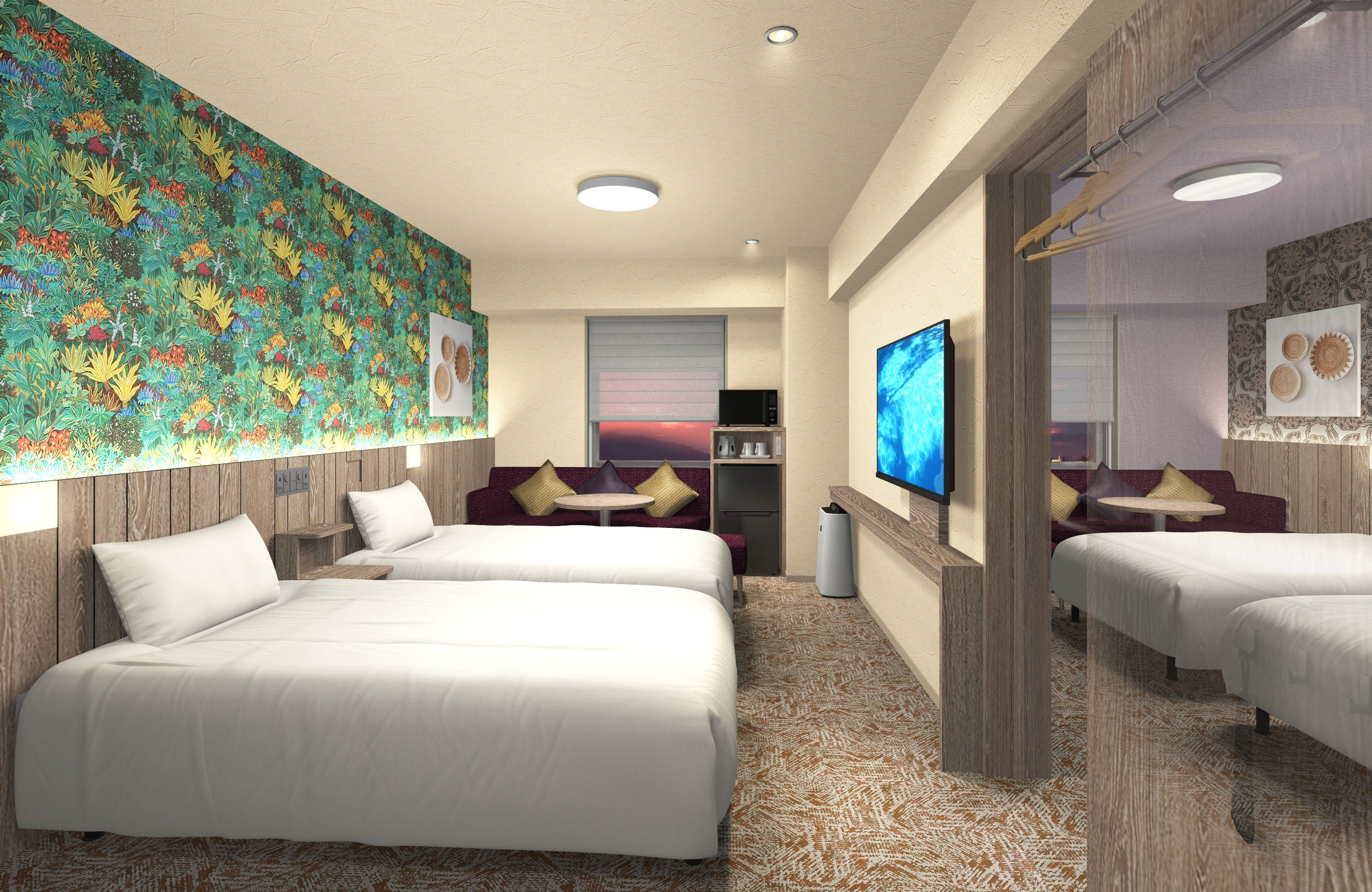 客室は、3名様でご利用可能な「ツインルーム」(18.27m²)と、4名様でご利用可能な「和モダンルーム」(22.21m²、28.42m²)が全体の6割を占め、グループ滞在には最大6名様でご利用いただける「コネクティングルーム」を8組ご用意。