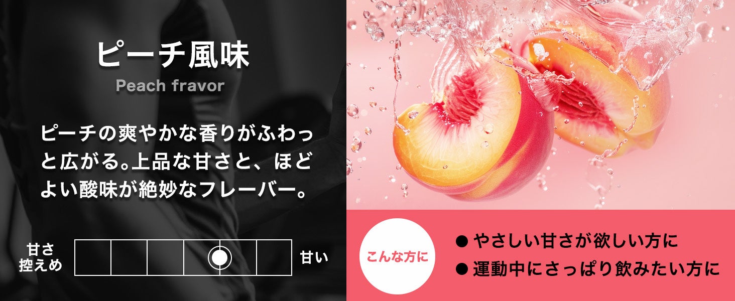 口に入れた瞬間、ピーチの爽やかな香りがふわっと広がる。上品な甘さとほどよい酸味のバランスが絶妙で、すっきりとした後味がトレーニング中にもぴったりなフレーバー!