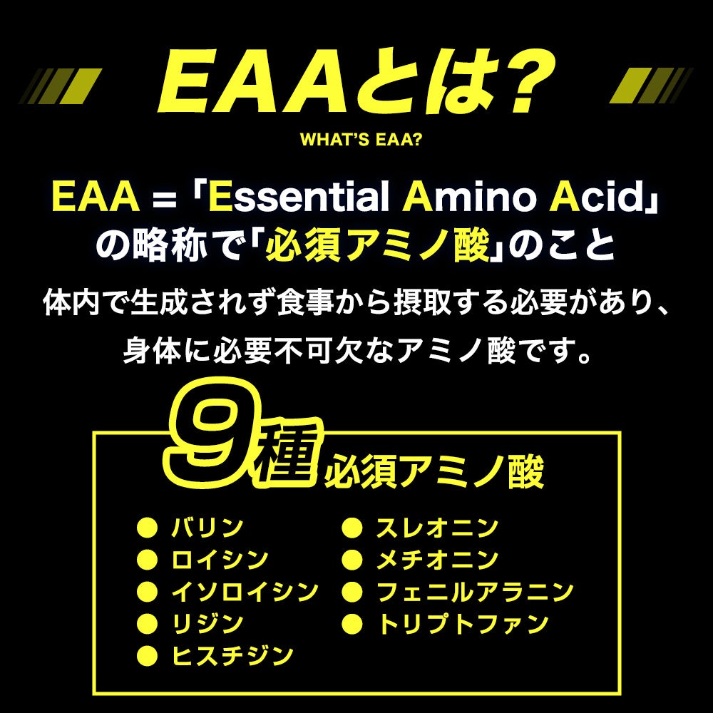 EAAはEssential Amino Acidの略称で必須アミノ酸のこと。