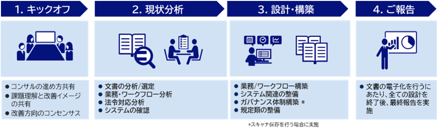 書類の電子化コンサルティングサービスは、「現状分析」と「設計・構築」の2段階で実施致します。