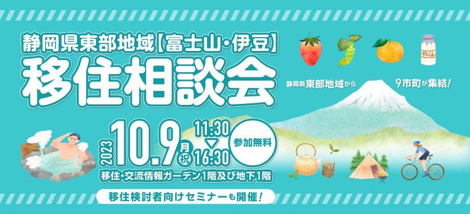 移住希望地3年連続全国No1「静岡県」で人気の東部地域から、9つの市町が10月9日(月曜・祝日)東京駅近くに集結!東部地域(富士山・伊豆)の移住相談と「失敗しない移住のためのミニセミナー」を開催