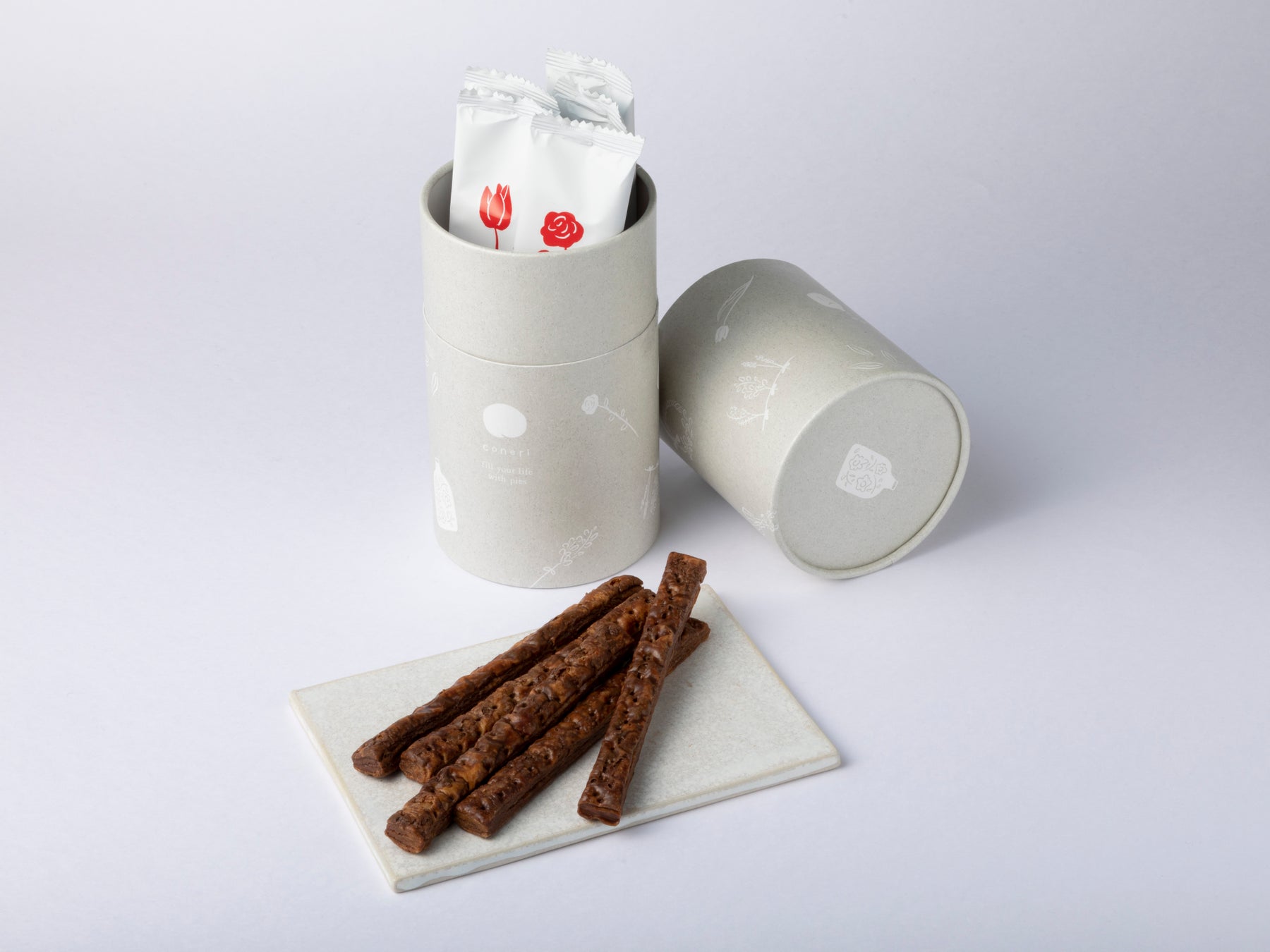 ナッツを思わせる香りと濃厚な旨味が特徴のベネズエラ産カカオを程よい塩気とザクザク食感の米粉×こねり粉パイに染み込ませました。ハーバリウム・ドライフラワー・リースモチーフの期間限定パッケージ。
